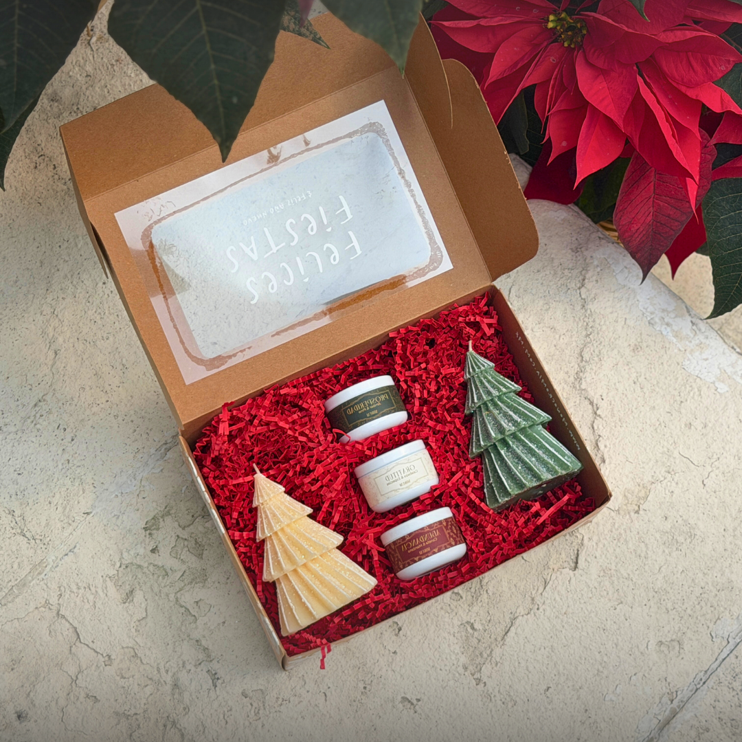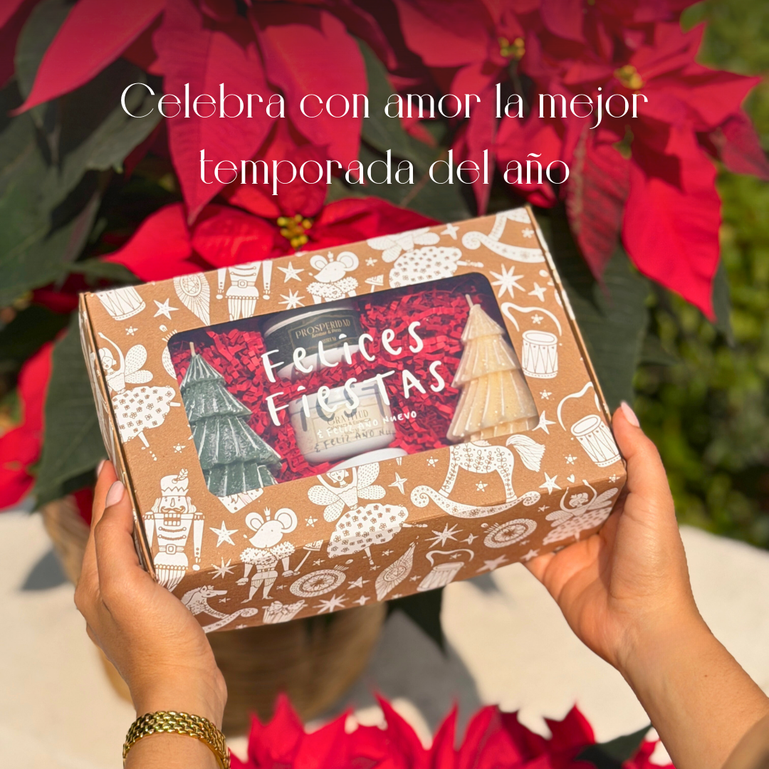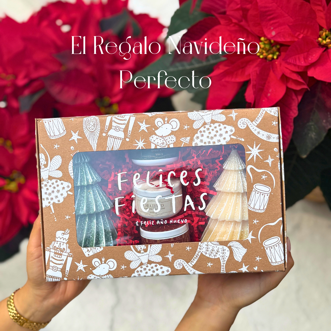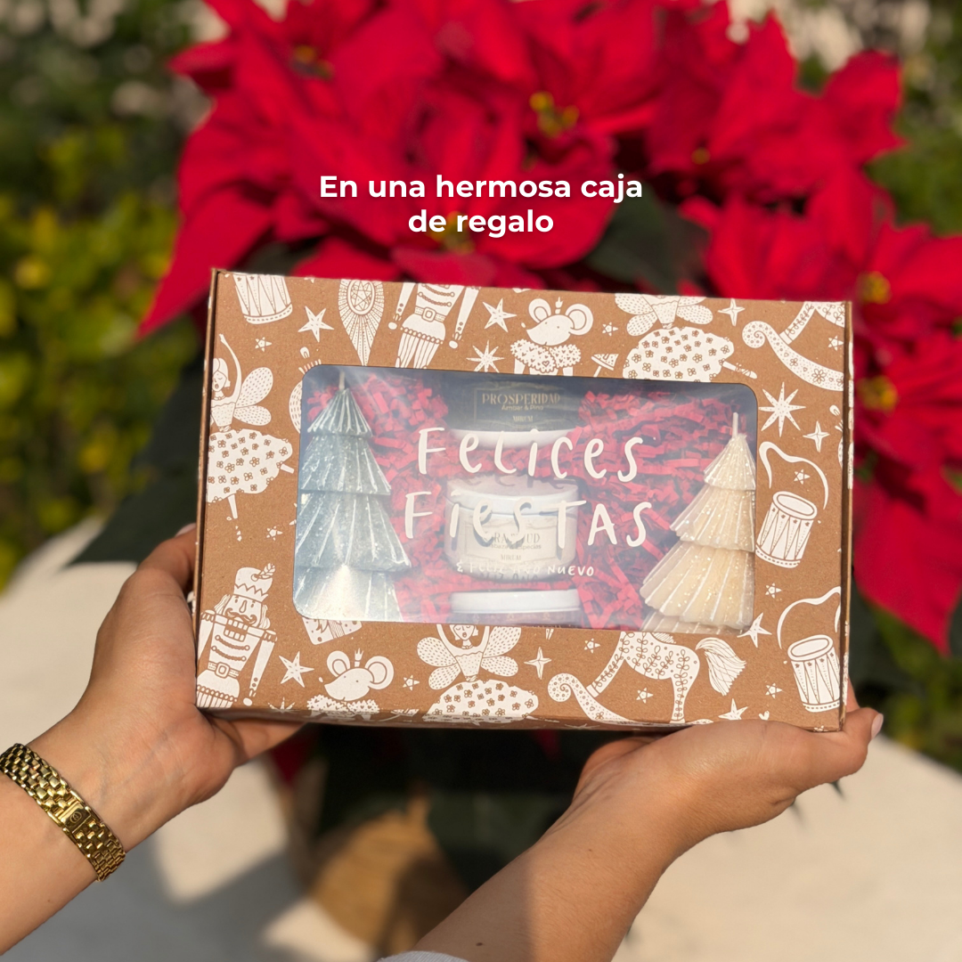 Todo envuelto en una hermosa caja de regalo con diseño navideño.